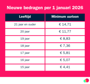 Per 1 januari 2026 worden de minimumlonen verhoogd. Het wettelijk minimumloon is per die datum: €14,71 per uur. Tegelijkertijd wordt ook het wettelijk minimumjeugdloon verhoogd.